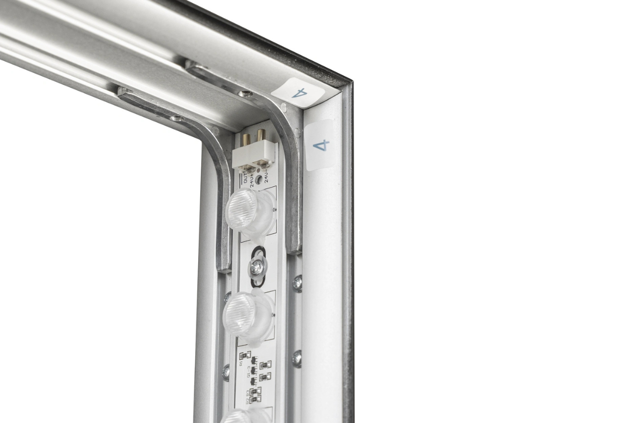 Obojstranne podsvietený lightbox tvorí rozkladací rám s 2 stabilizačnými nohami. Rám je ľahko rozložený v priebehu 3 minút bez použitia náradia. Zabudovaný transformátor s 1,9 m káblom a integrované LED diódy, dokonale presvetlia 2 textilné panely obojstranne, bez vnútorných tieňov. Bočné strany lightboxov sú magnetické, stačí lightboxy k sebe priložiť a vzájomne sa spoja do väčšej zostavy.