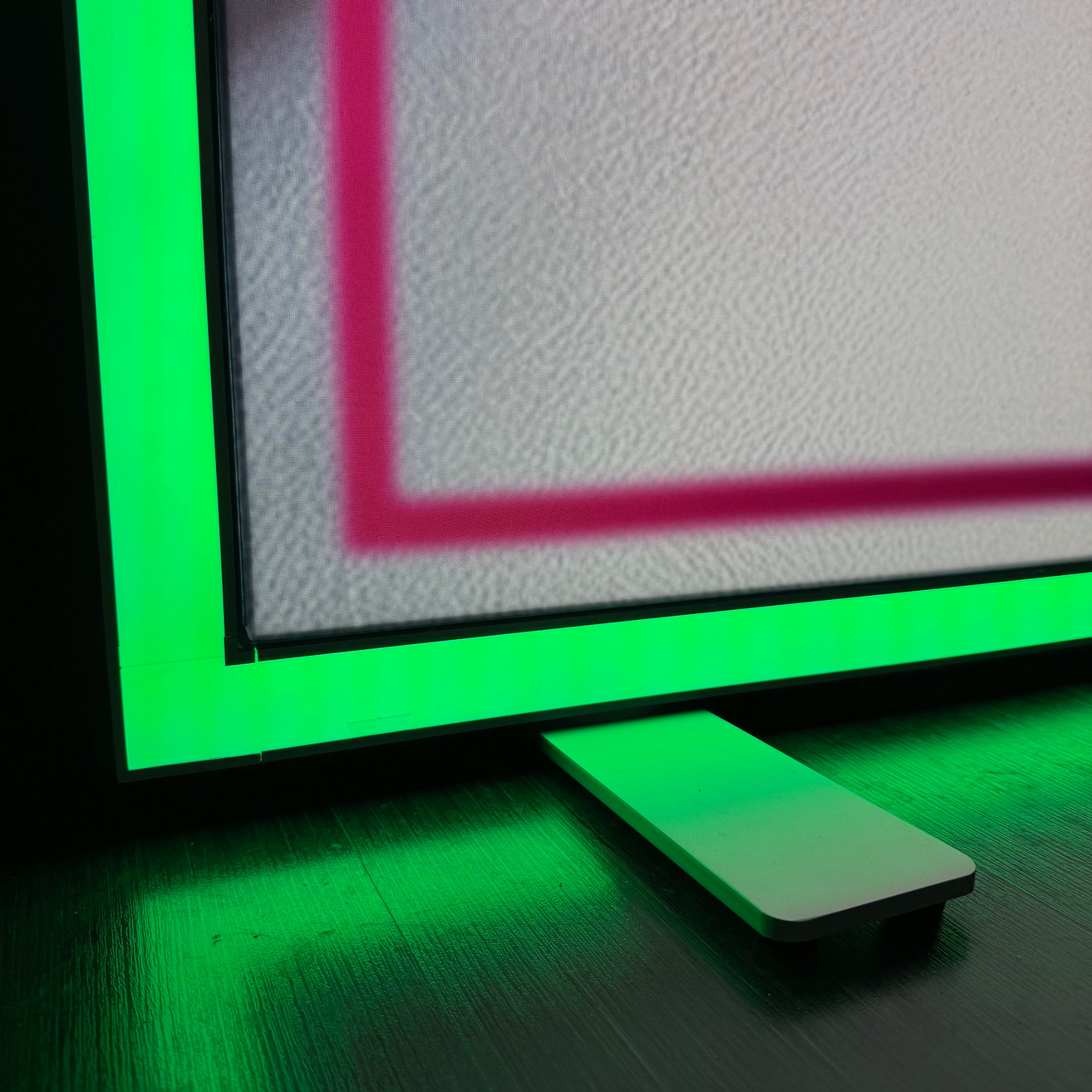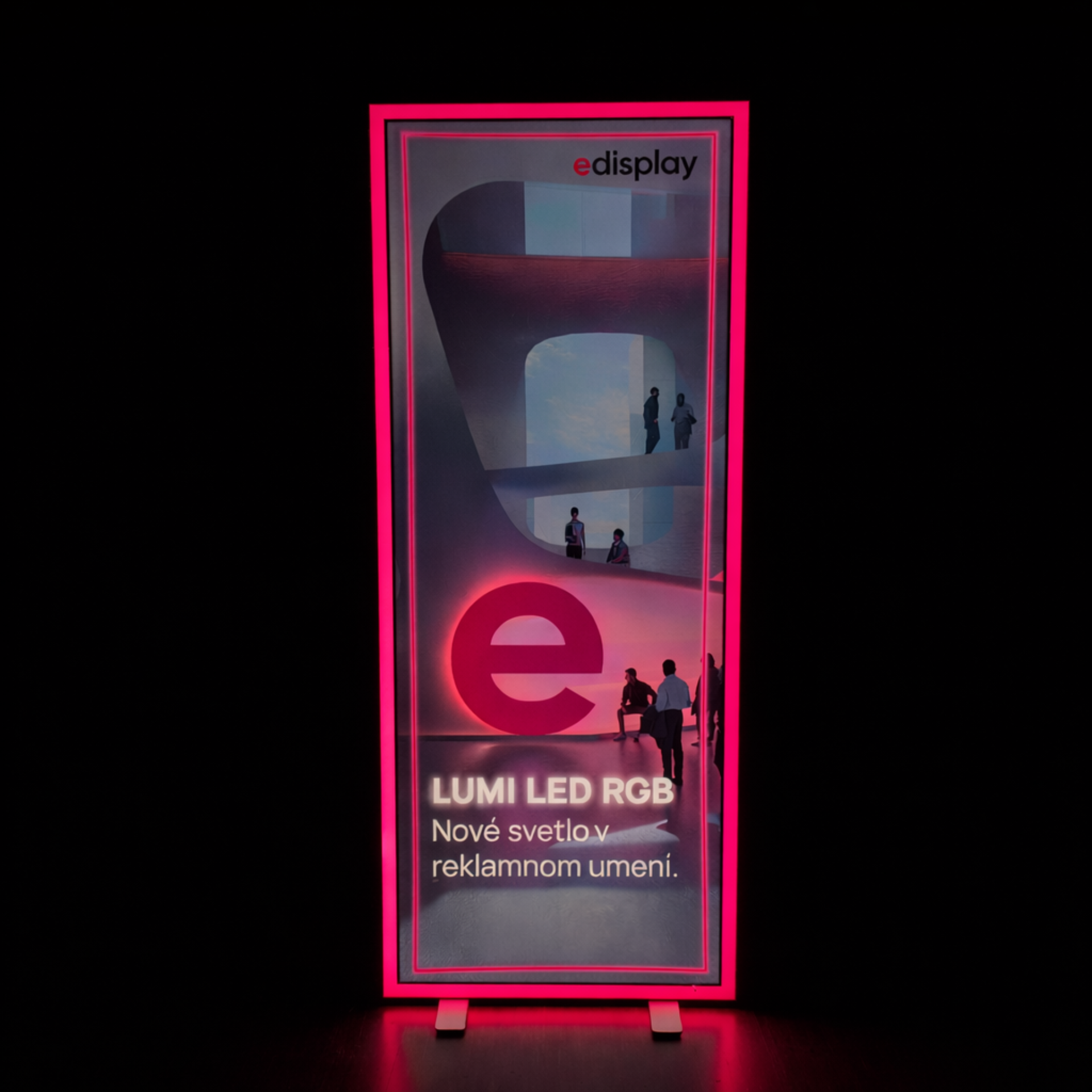 LUMI LED RGB je navrhnutý ako svetelný objekt, nie len nosič grafiky. Hliníkový rám so šírkou 8 cm obsahuje dve osvetľovacie vrstvy – EDGE LED podsvietenie pre grafiku a samostatný RGB svetelný rám. Tento kontrast svetla a farby vytvára výrazný, no stále čistý architektonický efekt, ktorý funguje v otvorenom priestore aj v rámci stánku.